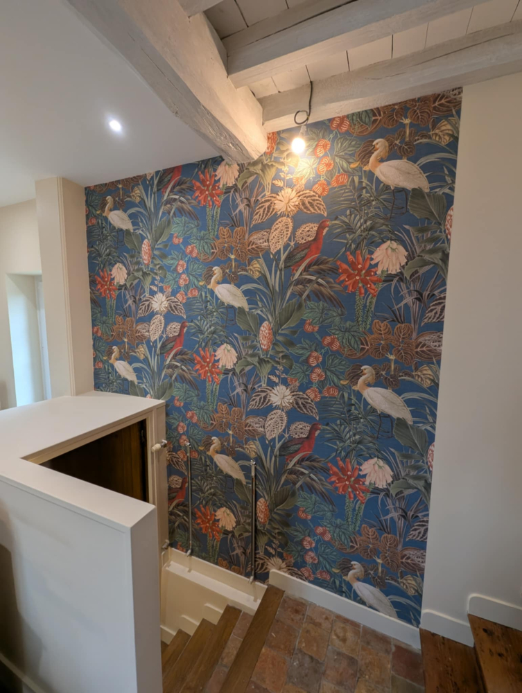 SARL LONGO Frères à Ambérieu-en-Bugey vous présente ses dernières photos. Rénovation d'un accès à la cave. Le choix du papier peint pour mettre en valeur cet espace à été choisi. Prenez contact dès à présent : Entreprise de peinture confort thermique, Ambérieu-en-Bugey. Zoomer Zoomer